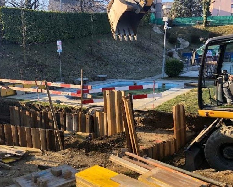 Sostituzione collettore comunale acque miste e acque meteoriche, esecuzione di camere di confluenza in calcestruzzo armato e lavori di pavimentazione strada Cantonale e Comunale, in contesto cittadino particolarmente trafficato.